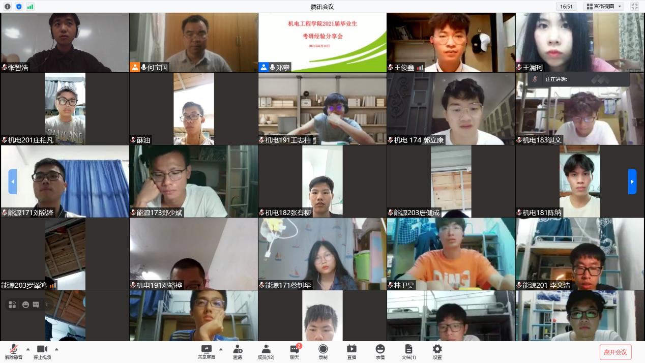 为了更好指导机电学子考研工作,帮助更多师弟师妹圆考研梦,6月16日晚上,机电工程公司利用腾讯会议举行考研经验交流会。本次交流会邀请了公司2021届已被录取为硕士研究生的六名同学进行分享,该公司党委副书记何宝国,各年级辅导员及有考研意向的同学参加会议。