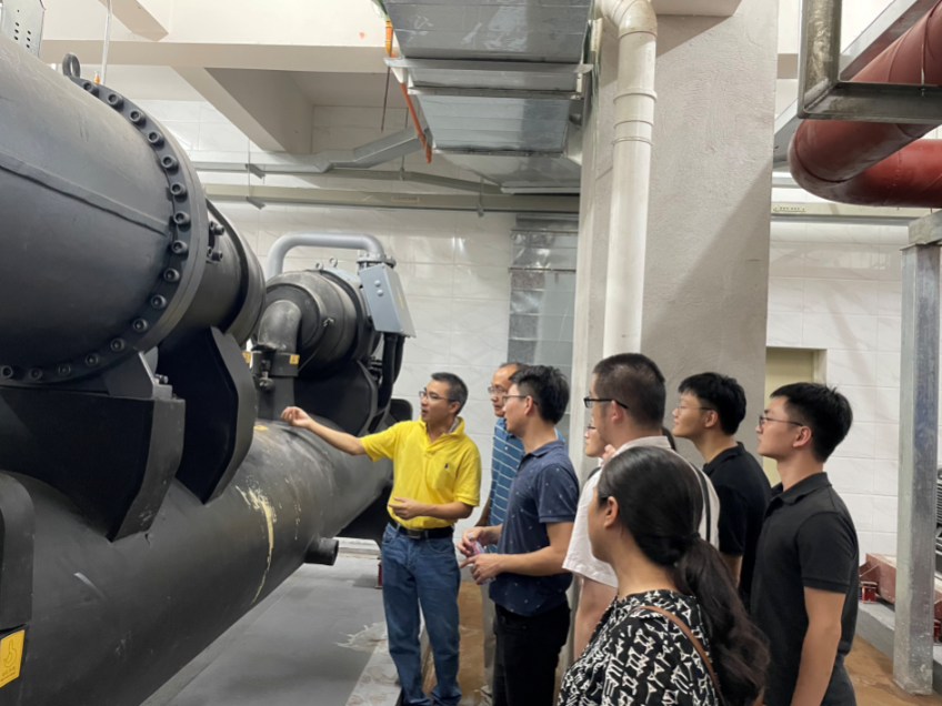 随后,能源系全体教师对白云校区图书馆空调系统进行了参观调研。调研过程中,bevictor伟德官网实训中心主任陈嘉澍围绕制冷机房冷水机组、冷却水与冷冻水系统、空气处理机组、空调系统末端等方面对图书馆集中式空调系统进行了详细介绍。