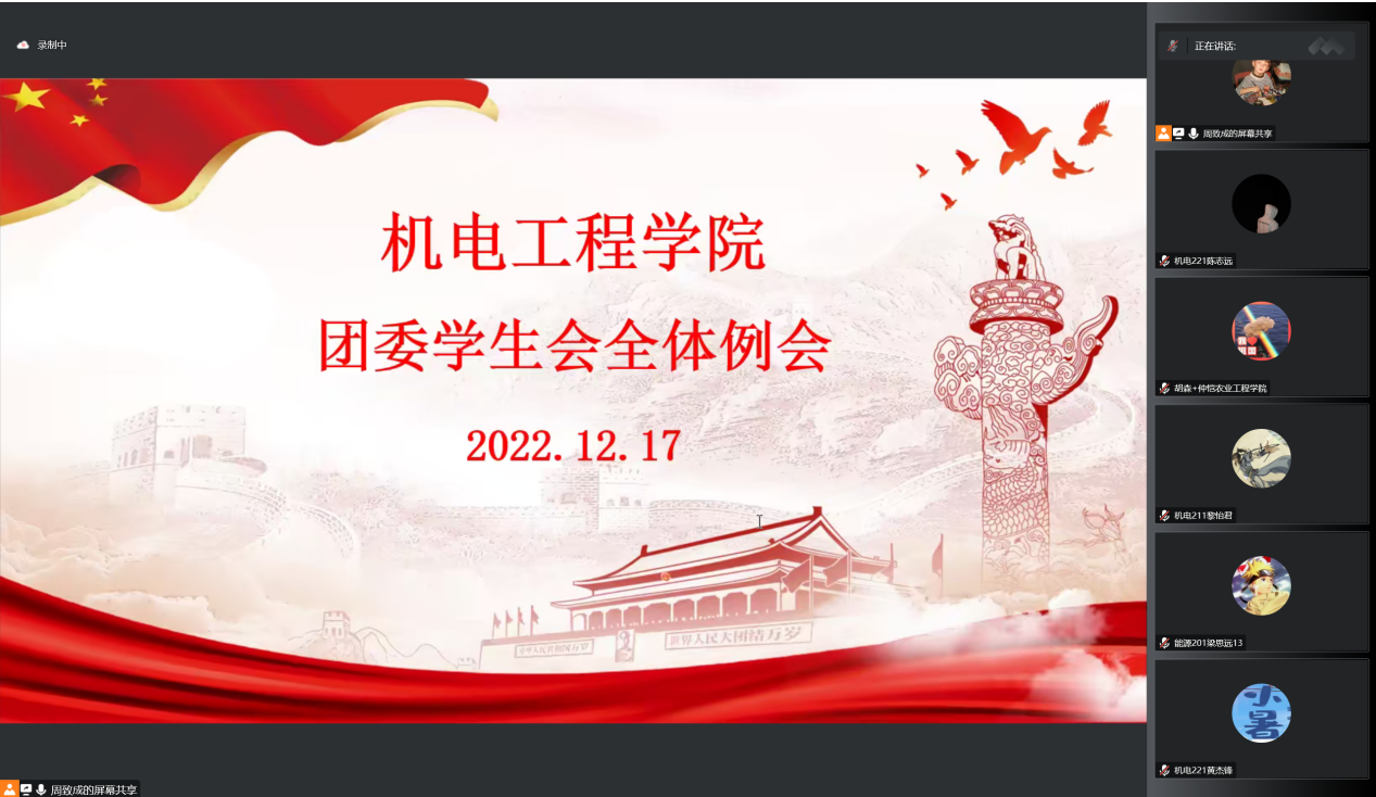 为及时总结本学期团委员工会各部门的工作情况及规划下学期的工作,促进公司团委员工会的各项工作高质量完成,2022年12月17日晚上,公司团委员工会以线上的形式召开全体工作人员例会。团委员工会指导老师胡森、李筱曼、校青马班成员、公司团委员工会全体成员参加本次会议。本次会议由周致成主持。